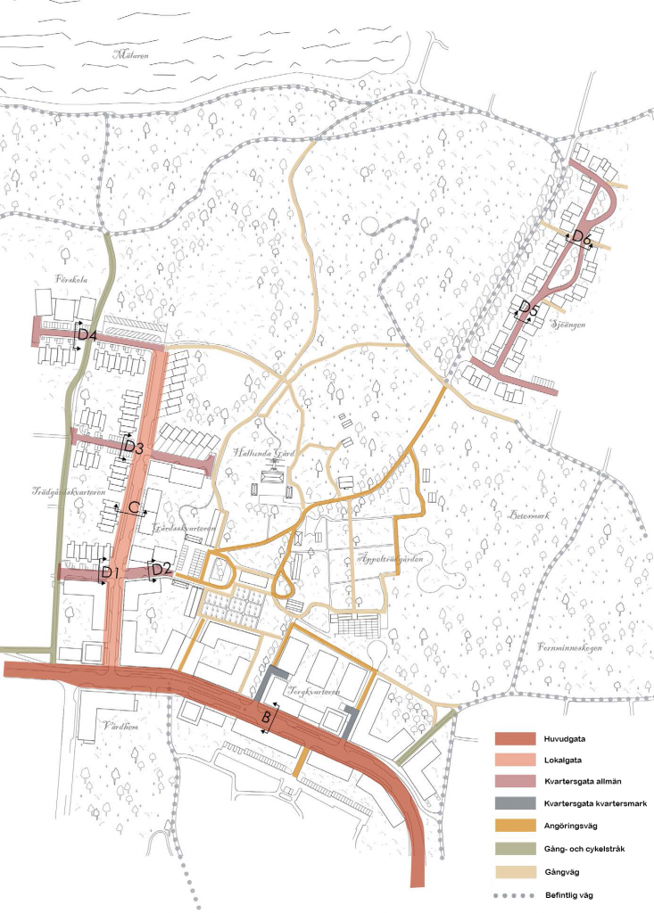 Since the Bronze Age, Hallunda Gård has been an important settlement for both humans and animals. Making the site accessible must be done with the utmost care. In this project, a network of walking paths is created to open up the surrounding nature. Existing movement patterns are incorporated, and the street structure channels flow into the park environment. Three important and well-established paths already run through the area; these are preserved and complemented with new walkways. Together with the new residential environments, these paths create a safe and accessible recreational landscape.