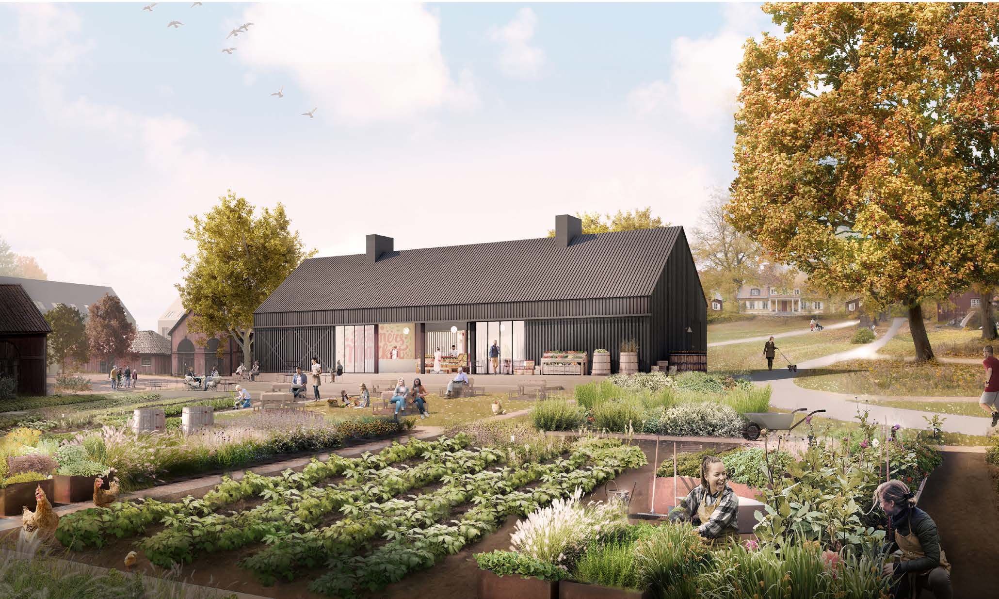 In the Hallunda Gårdspark project in Botkyrka, a new restaurant building is added to the existing farm. Directly adjacent to it, cultivation areas are established to enable the production of food served in the restaurant. An existing orangery is being renovated, and a new greenhouse is added to the original structure.