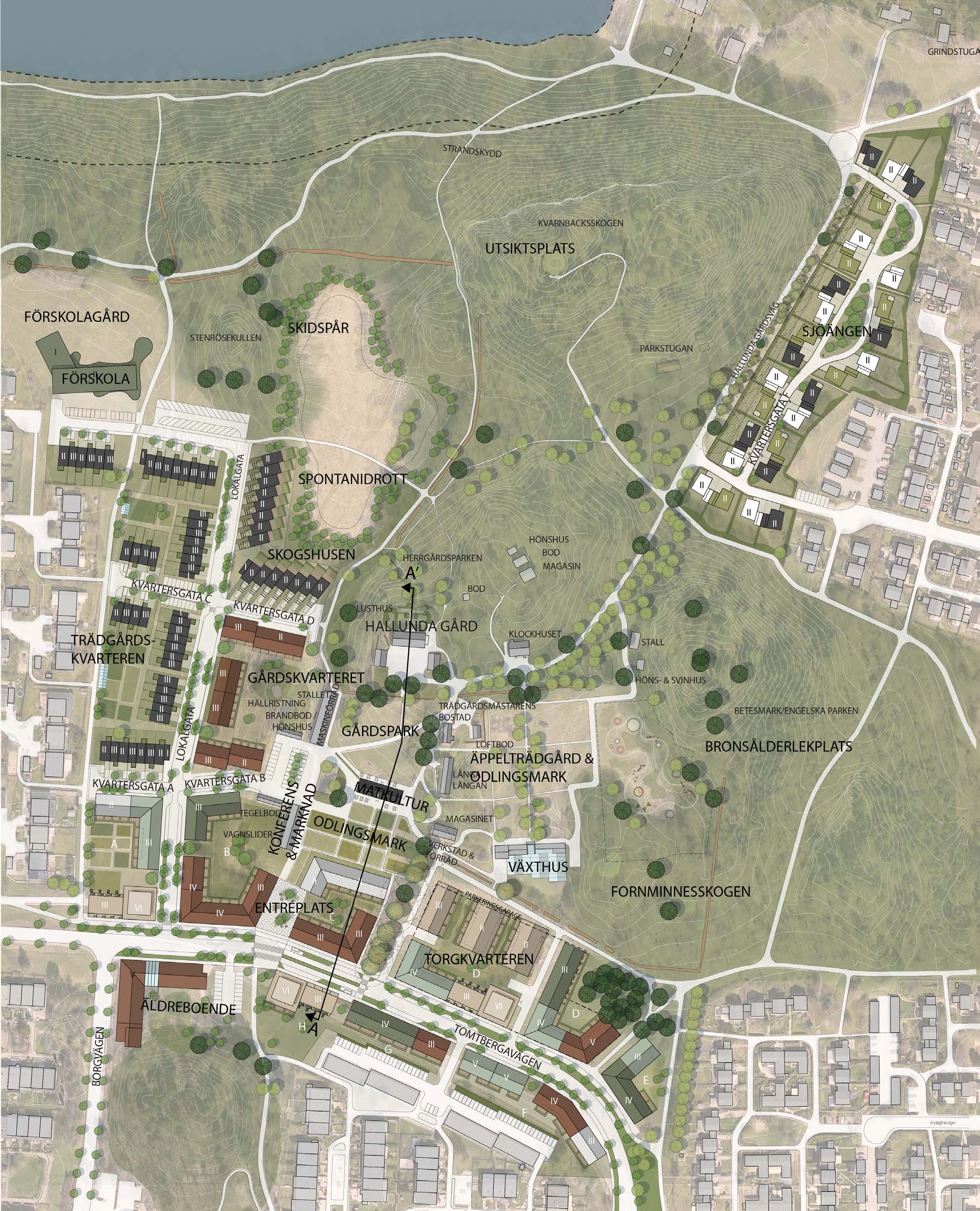 The development of Hallunda Gårdspark involves both the activation and enhancement of existing buildings, parks, natural areas, and streets, as well as the addition of new buildings, roads, public spaces, and residential plots.