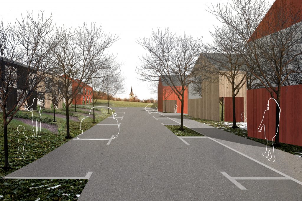 Sightlines through the area are important to illustrate how the buildings relate to existing landmarks and integrate with their surroundings. Key target points for the sightlines include the church to the east, the woodland area to the north, and the forested hill with burial grounds to the south (A). The existing oak trees along Asptunavägen will be preserved, and new trees will be planted to evoke the historical pathway leading down to the tenant’s residence (B). A park corridor will be established along the existing field ditch, running east–west through the area (C). At each end of the corridor, communal gathering spaces will be created for play and recreation. Existing vegetation, including a large oak and trees near the tenant’s residence, will be retained.