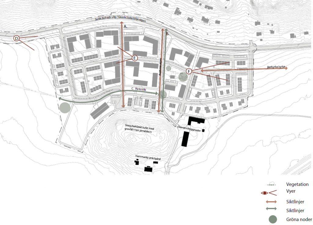 Sightlines through the area are important to illustrate how the buildings relate to existing landmarks and integrate with their surroundings. Key target points for the sightlines include the church to the east, the woodland area to the north, and the forested hill with burial grounds to the south (A). The existing oak trees along Asptunavägen will be preserved, and new trees will be planted to evoke the historical pathway leading down to the tenant’s residence (B). A park corridor will be established along the existing field ditch, running east–west through the area (C). At each end of the corridor, communal gathering spaces will be created for play and recreation. Existing vegetation, including a large oak and trees near the tenant’s residence, will be retained.