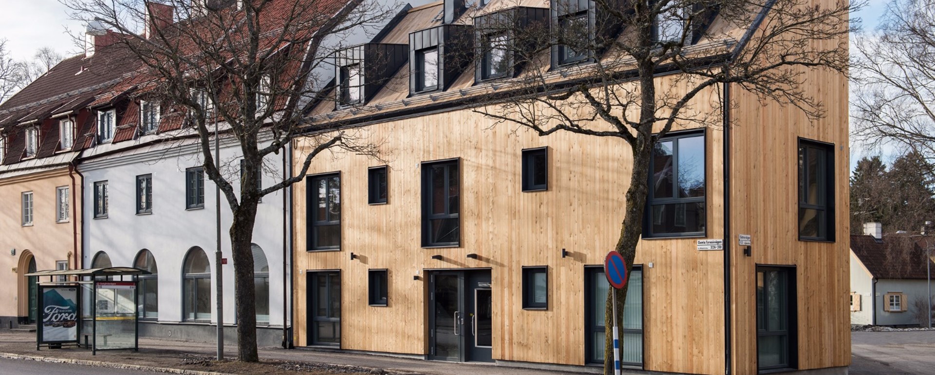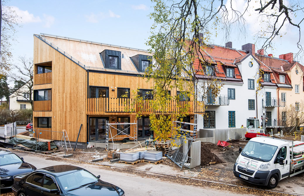 Modellvillan consists of two buildings with a total of 15 residential units and is a renovation and extension project of an existing property in southern Enskede, Stockholm. The original 1920s building has been fully renovated and complemented by a newly constructed wooden extension. The extension was designed by Architema Architects.
