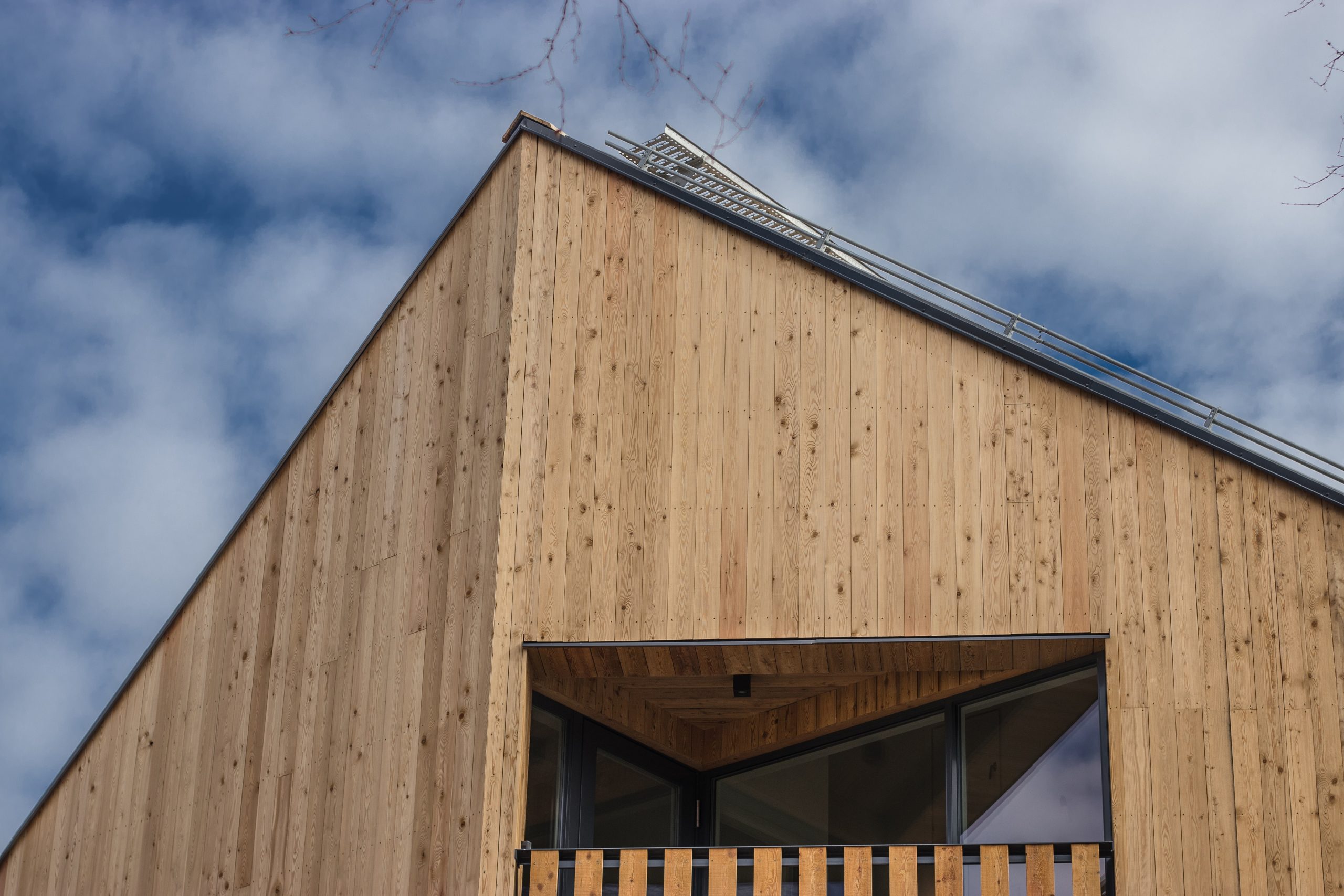Until 2016, Modellvillan consisted of a white-plastered 1920s house accompanied by an industrial building of similar design. Titania replaced the deteriorated industrial structure and its worn loading dock with a modern wooden extension. The new addition is a striking example of contemporary, environmentally conscious architecture, featuring a fully timber-clad façade punctuated by large windows of glass and metal. This innovative design both contrasts with and complements the older, traditionally styled building.