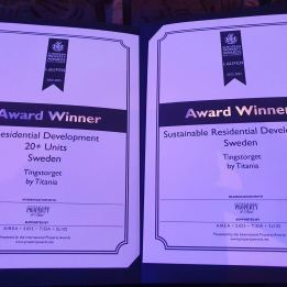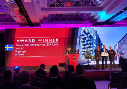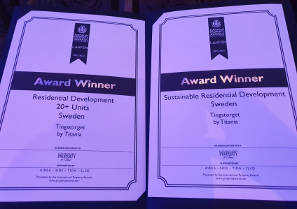 – Vi är mycket stolta över att Tingstorget nu tilldelas ett prestigefyllt internationellt pris i kategorierna Hållbar Bostadsutveckling och Bostadsutveckling för 20+ lägenheter. Vinsterna i de båda kategorierna känns som kvitton på att det hårda arbetet, från alla anställda och övriga inblandade i projektet, lönade sig, säger Titanias VD Einar Janson.